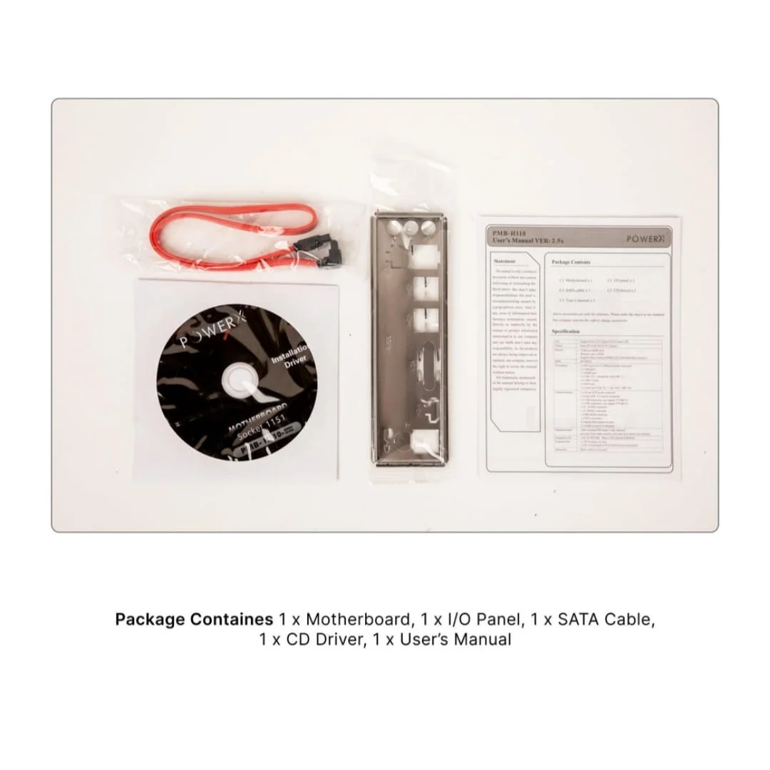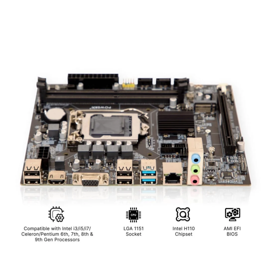 The PowerX H110 motherboard is a reliable and cost-effective solution for building or upgrading Intel-based desktop PCs. Designed to support 6th and 7th generation Intel Core processors, it offers stable performance for everyday computing, office work, and basic home use. With essential connectivity options and solid build quality, this motherboard is ideal for budget systems and replacements.