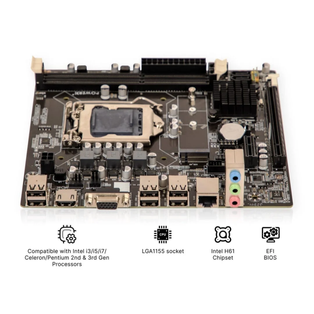 The PowerX PMB-H61 NVMe motherboard is a reliable and budget-friendly solution designed for Intel 2nd and 3rd generation processors. Built on the H61 chipset, it is ideal for office work, home use, and basic computing needs. With support for NVMe storage via adapter, stable 3-phase power design, and essential connectivity options, this motherboard delivers dependable performance for daily tasks and system upgrades.