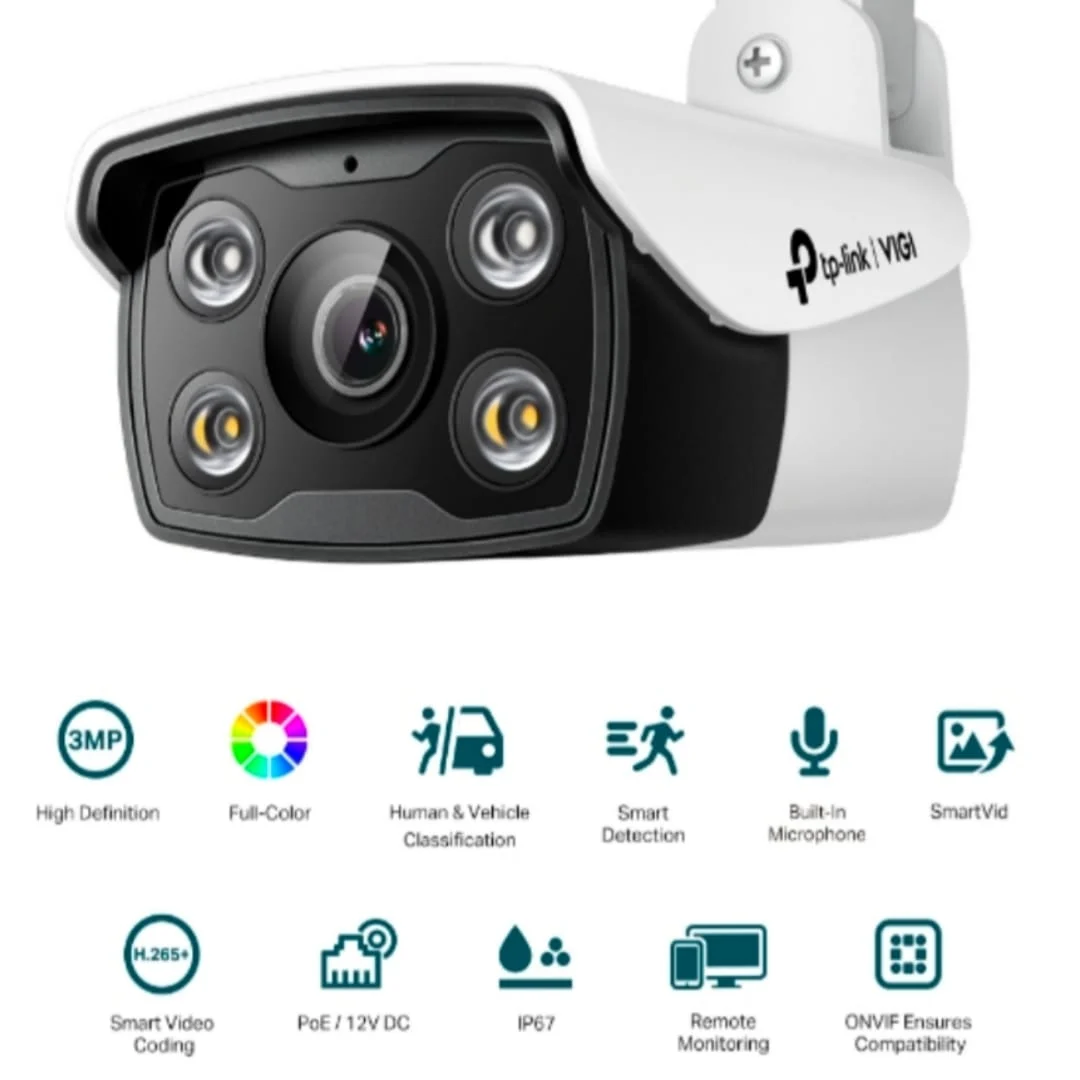 The TP-Link VIGI C330 is a 3 MP outdoor bullet network camera designed for 24-hour full-colour surveillance. It features AI-powered human and vehicle classification to reduce false alarms, smart detection (such as intrusion, line-crossing, object removal), and smart video enhancement (DWDR, Smart IR, 3D DNR, white balance). The camera supports H.265+ video compression for efficient storage, has a built-in microphone for audio within ~5 m, and is weatherproof with an IP67 rating. It can be powered via PoE (802.3af) or 12V DC.